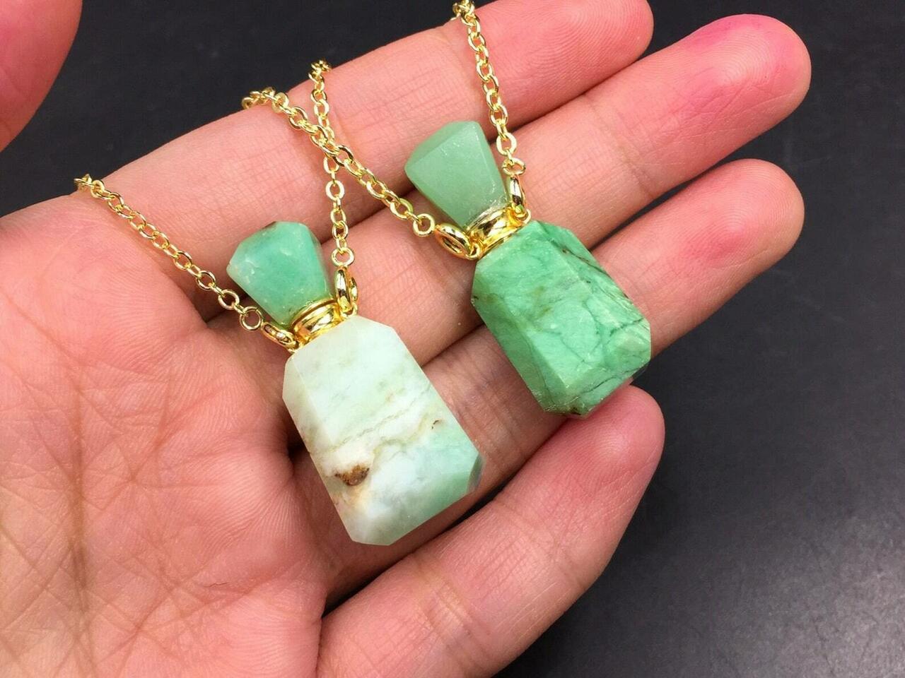 Krüsopraas parfüümipudeli kaelakee ripats difuuser.