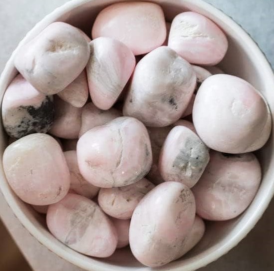 MANGO/ROOSA KALTSIIT (mangaankaltsiit) on inglite maailmaga kontaktis olev südamekristall. Andestamise kivina vabastab hirmu ja leina, mis hoiavad südant minevikuvangis, tuues sisse tingimatu armastuse. Aitab tõsta eneseväärikust ja enesega leppida, ravitseb närve ja vabastab pinge ning ärevuse. Hoiab eemal luupainajad. Kivi armastav energia lahustab õrnalt vastuseisu. Sellest on abi igaühele, kes on läbi elanud trauma või kallalekippumise.