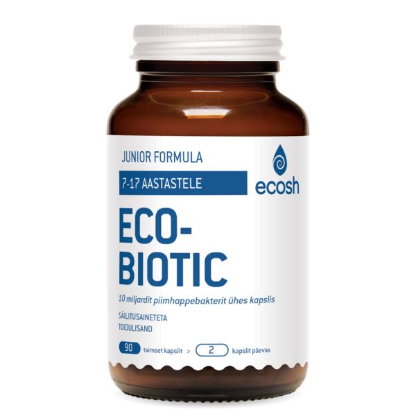 EcoBiotic Junior Formula probiootilised kapslid on mõeldud kasutamiseks noorukitele, 7-17aastastele. Päevane annus 2 kapslit sisaldab 20 miljardit kasulikku bakterit, mis aitab tõsta vajalike bakterite kontsentratsiooni organismis ja toetada immuunsüsteemi igapäevaselt. EcoBiotic Junior Formula sisaldab üksnes inimspetsiifilisi piimhappebakterid, mis toetavad tõhusalt soolestiku mikrofloorat ning osalevad aktiivselt toitainete lõhustamises ja imendumises. Iseäranis sobib toode kasutamiseks pärast antibiootikumi kuuri, et taastada kasulike bakterite kontsentratsioon mikroflooras.